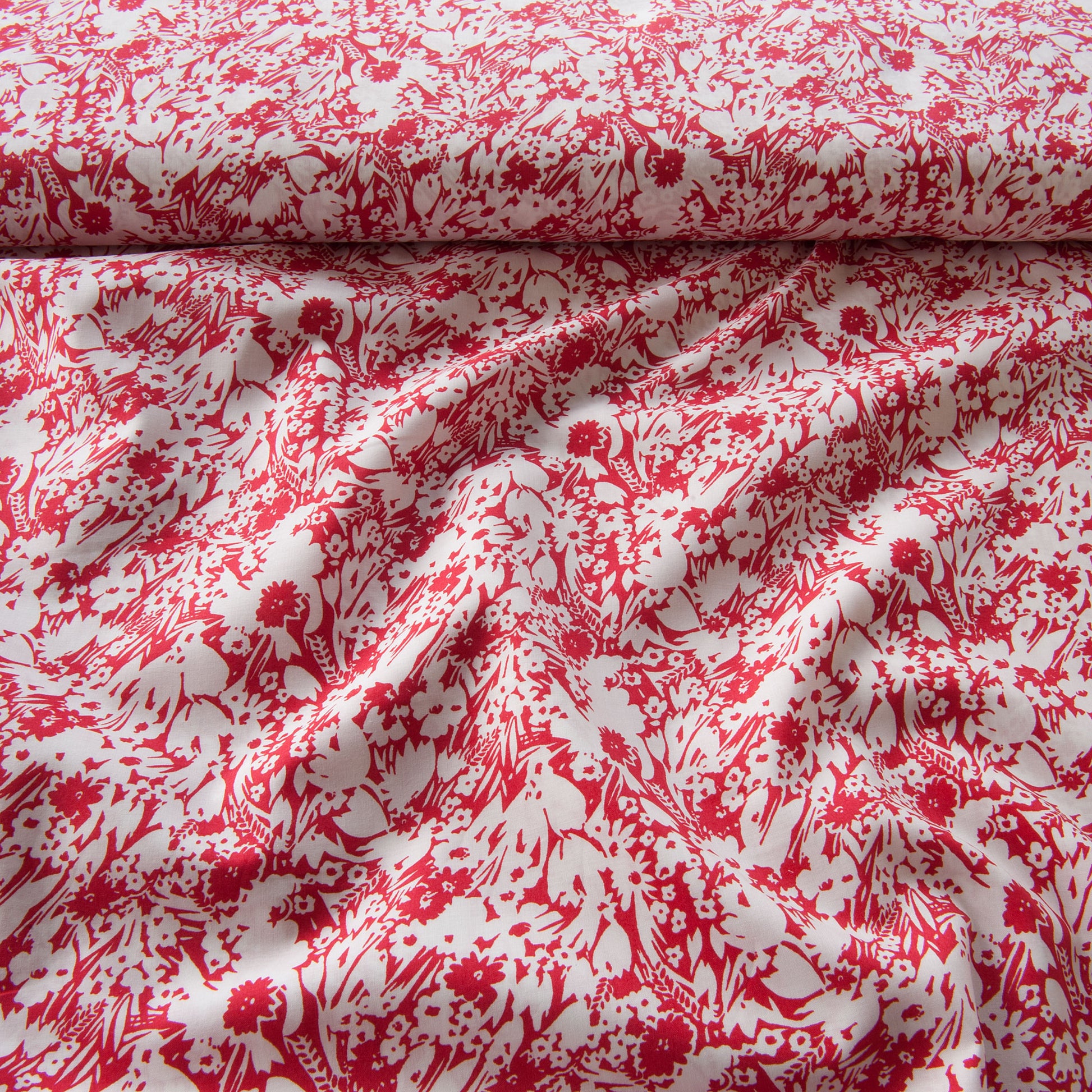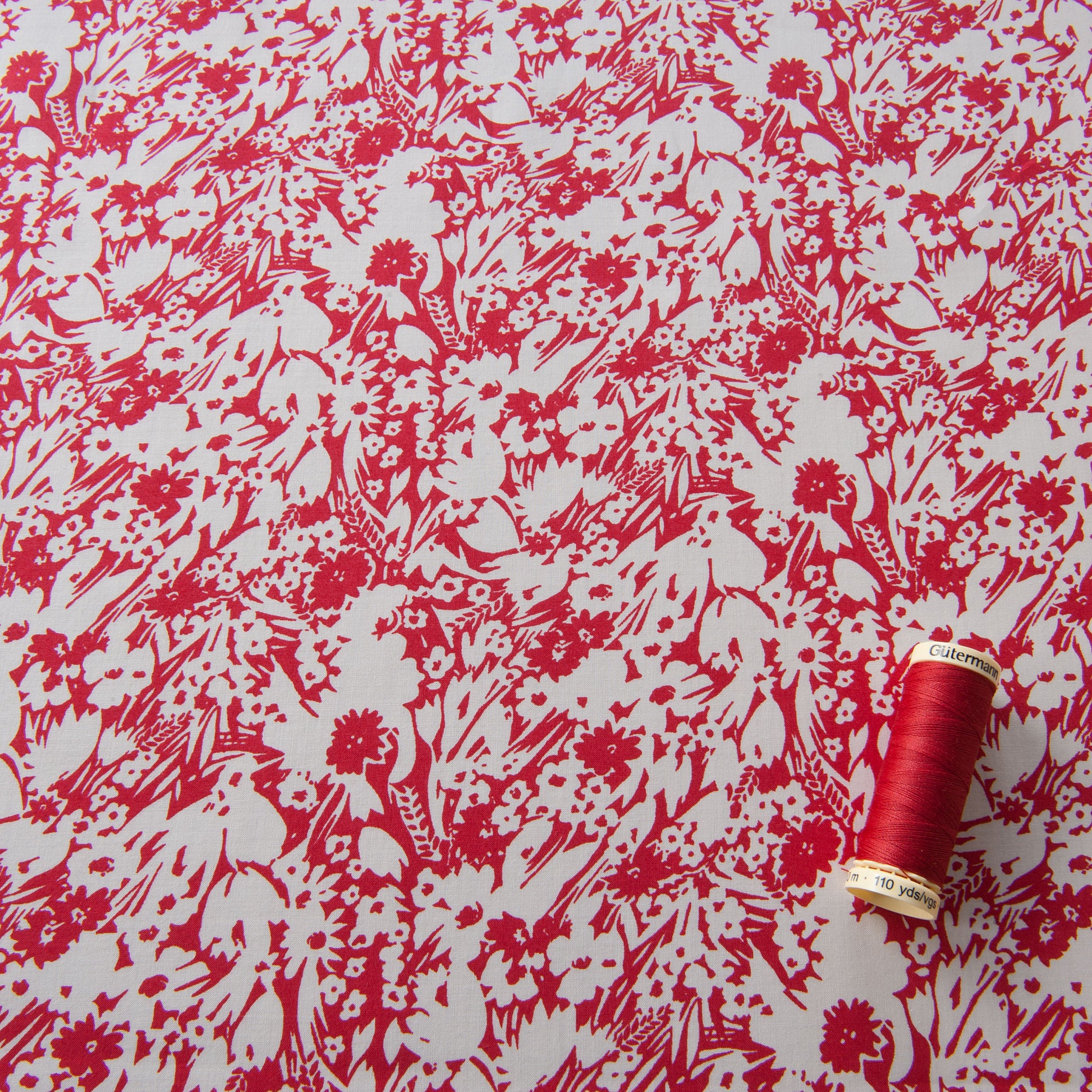 This cotton poplin has a red background with an ivory abstract floral / foliage design across it. This fabric is perfect for sewing yourself a dress, shirt or skirt.