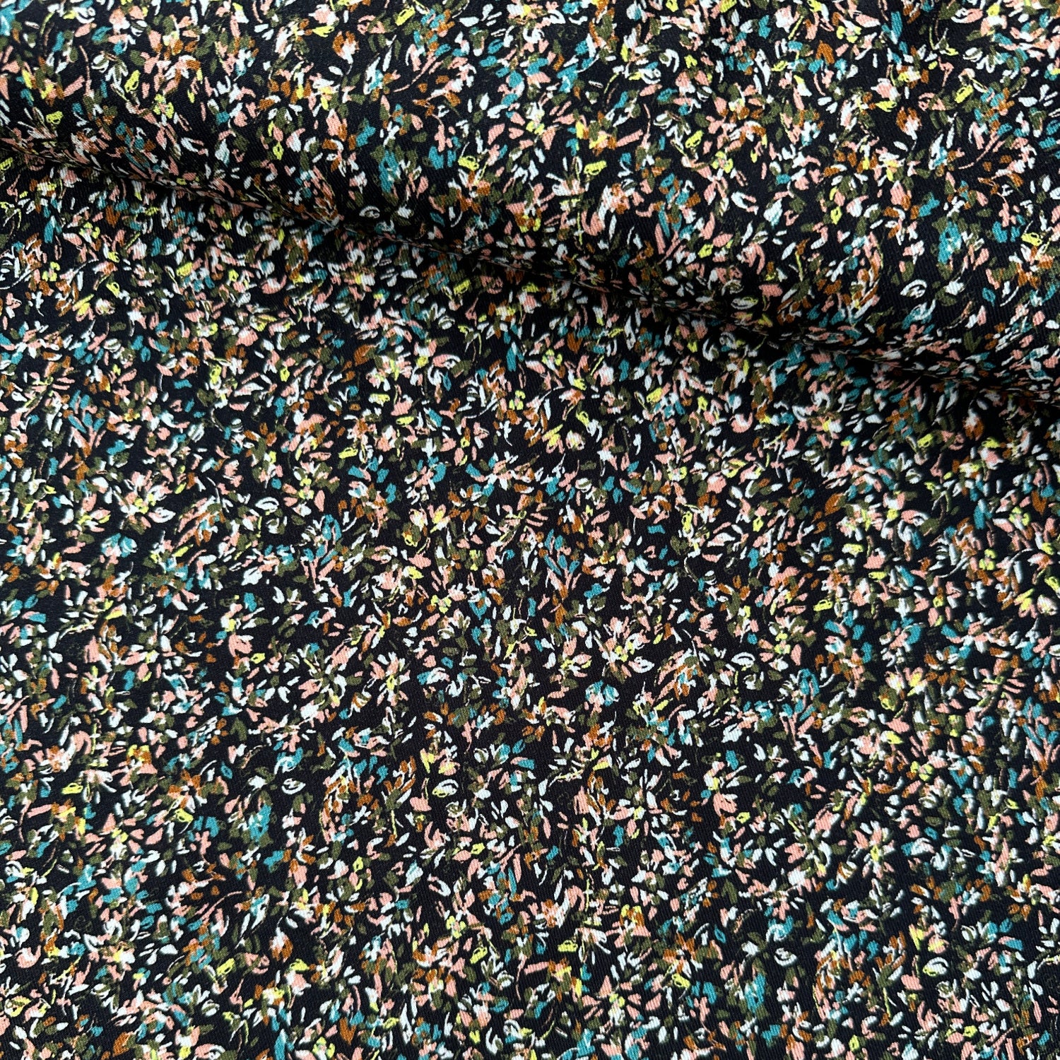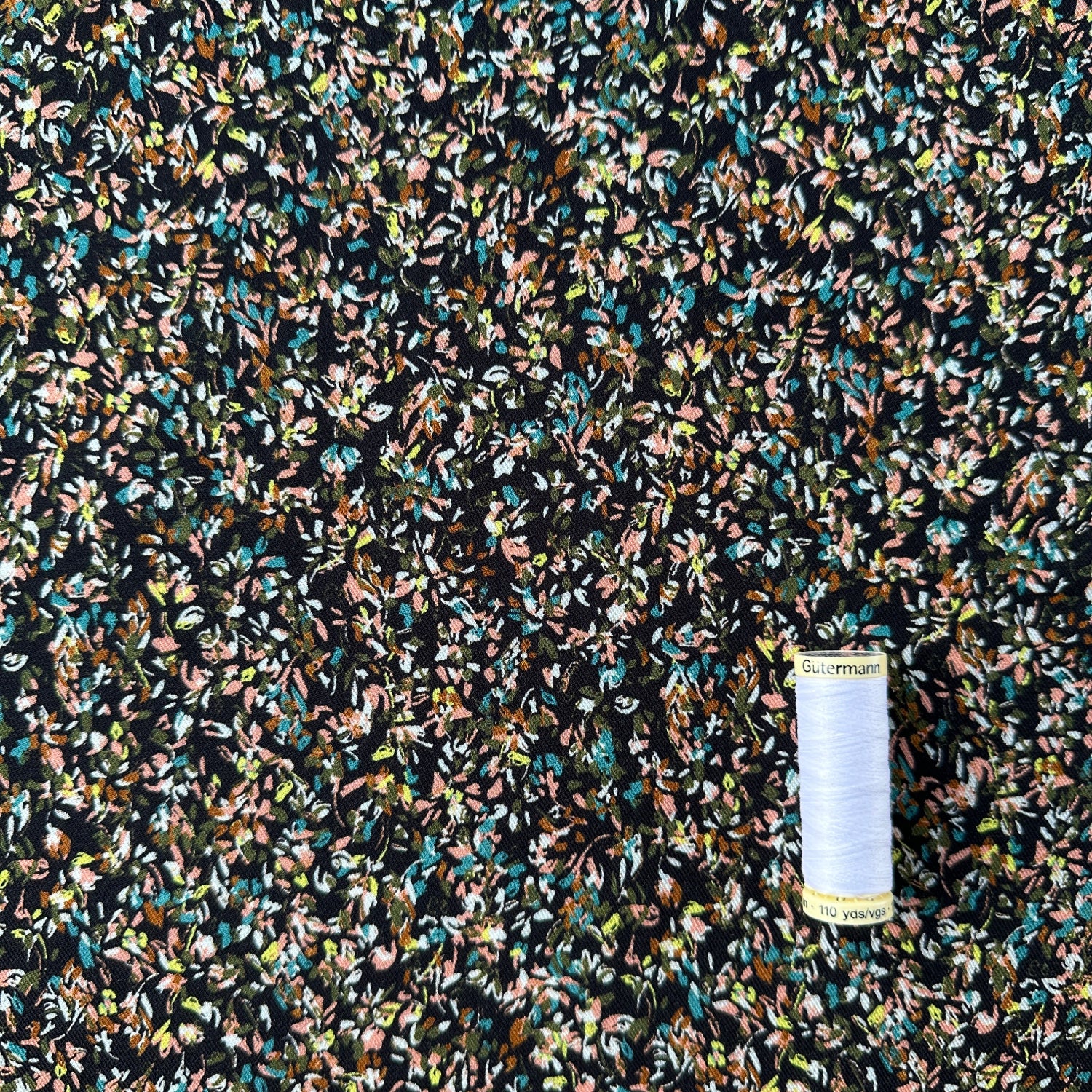 This beautiful viscose twill dressmaking fabric has a black background and a ditsy floral design across it. It is soft to the touch and with a gorgeous drape.
