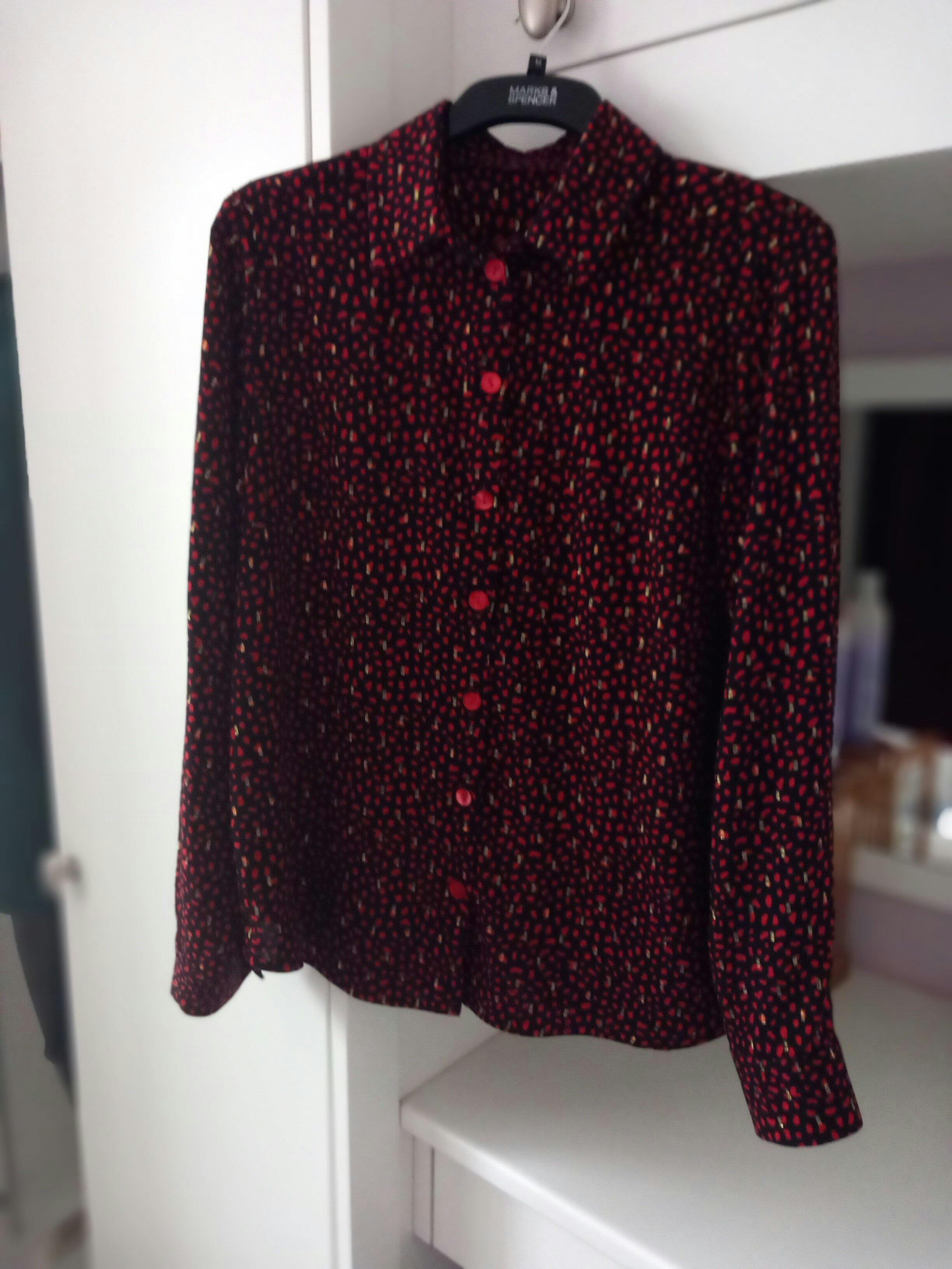 Black viscose dressmaking fabric with red spots of varying sizes across it and gold lurex thread woven into it. This fabric drapes beautifully and would be gorgeous sewn up into a blouse, skirt or dress.