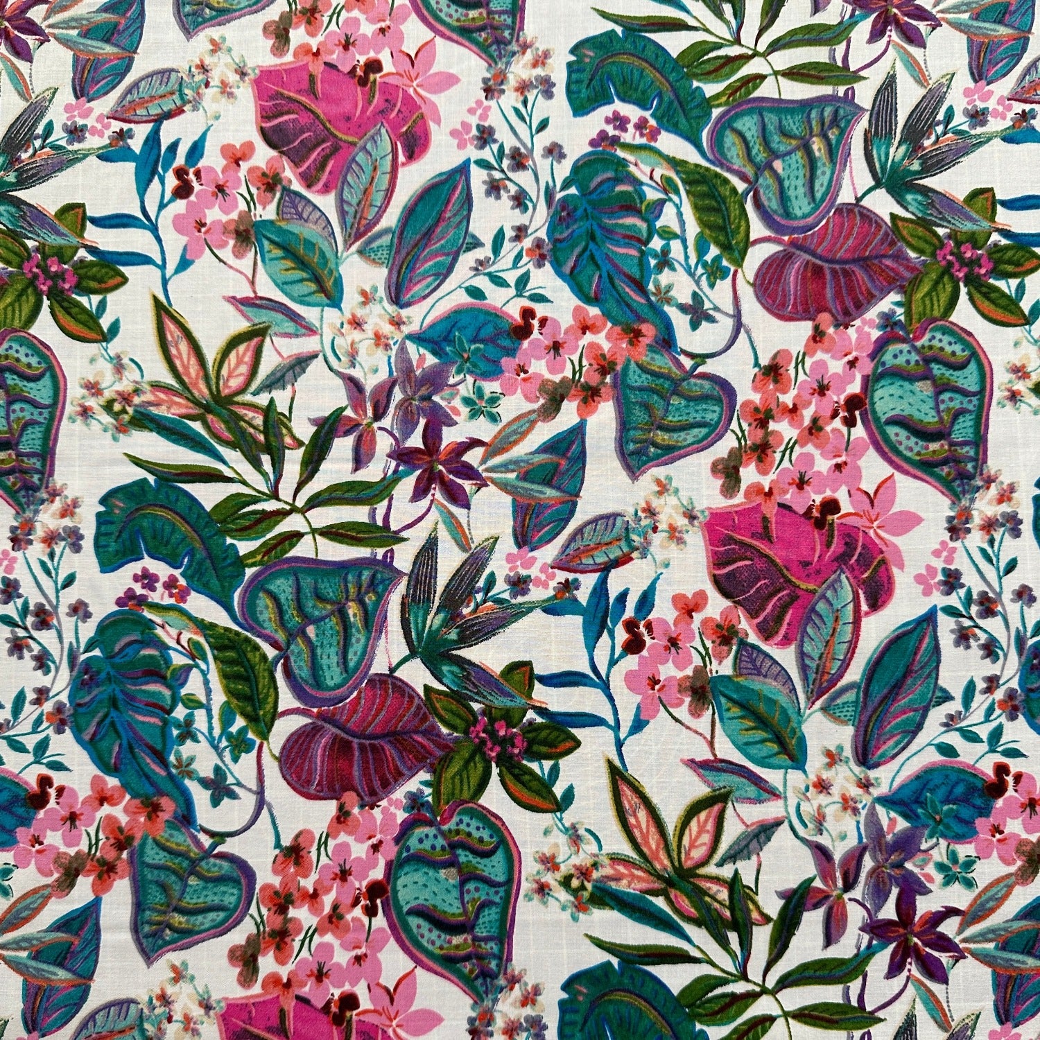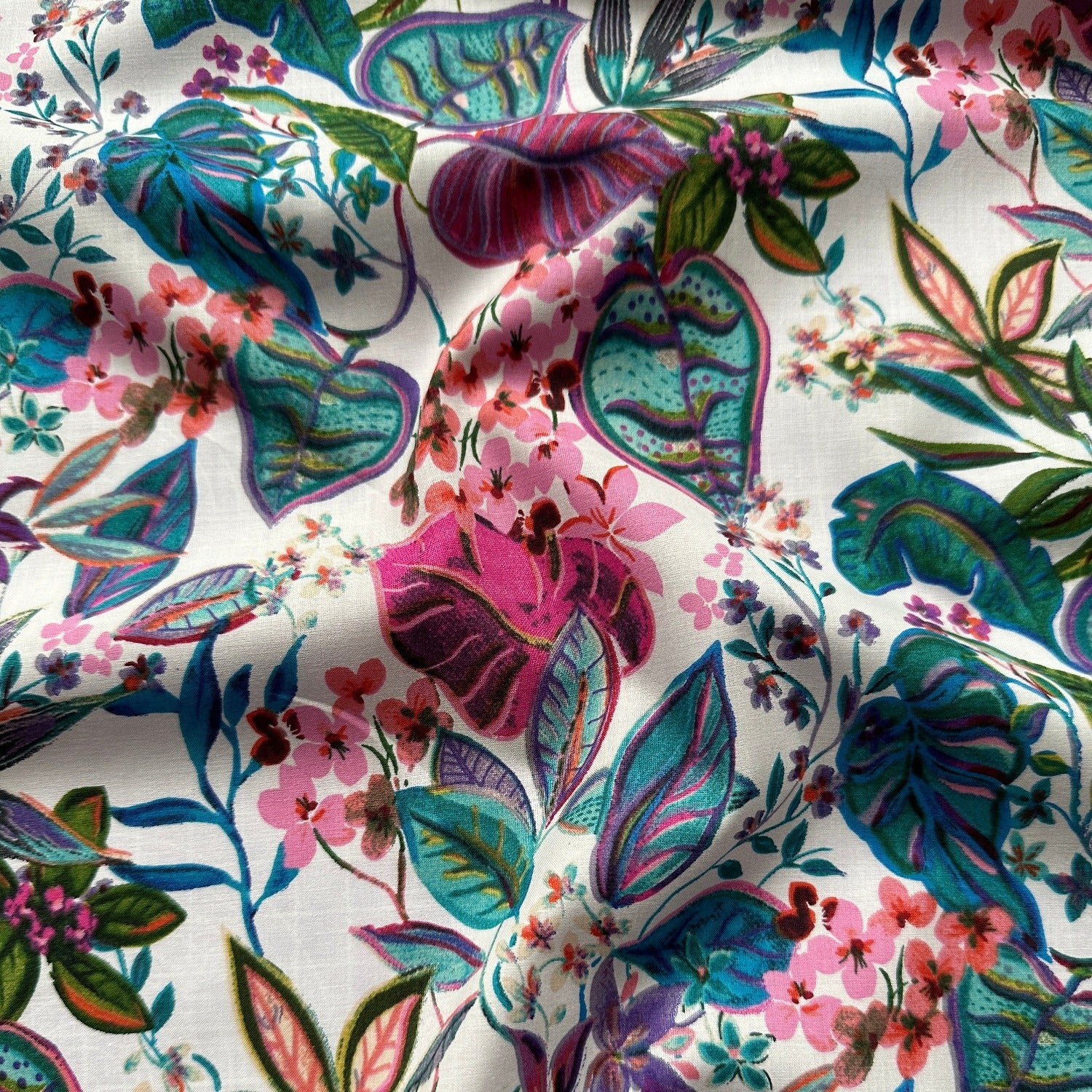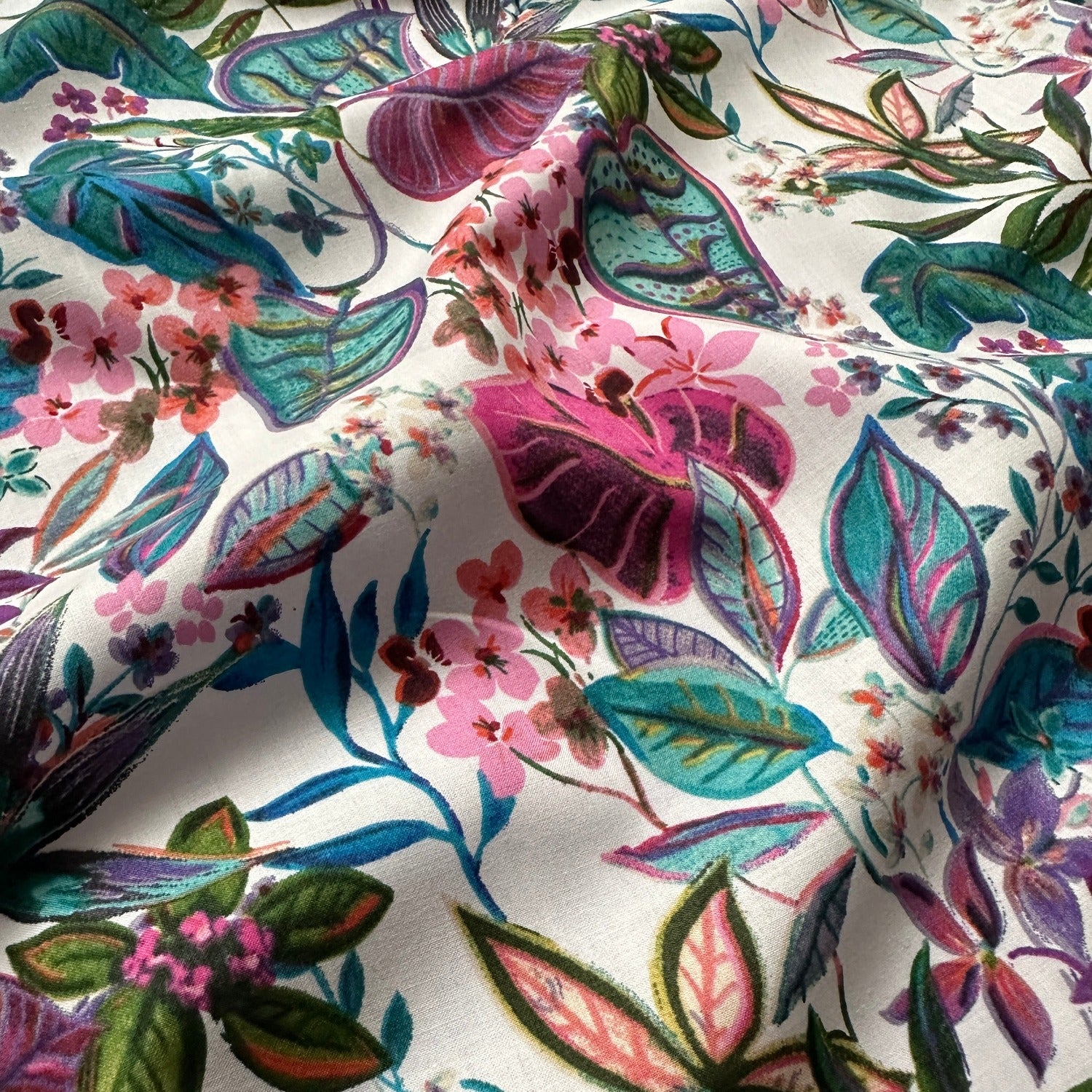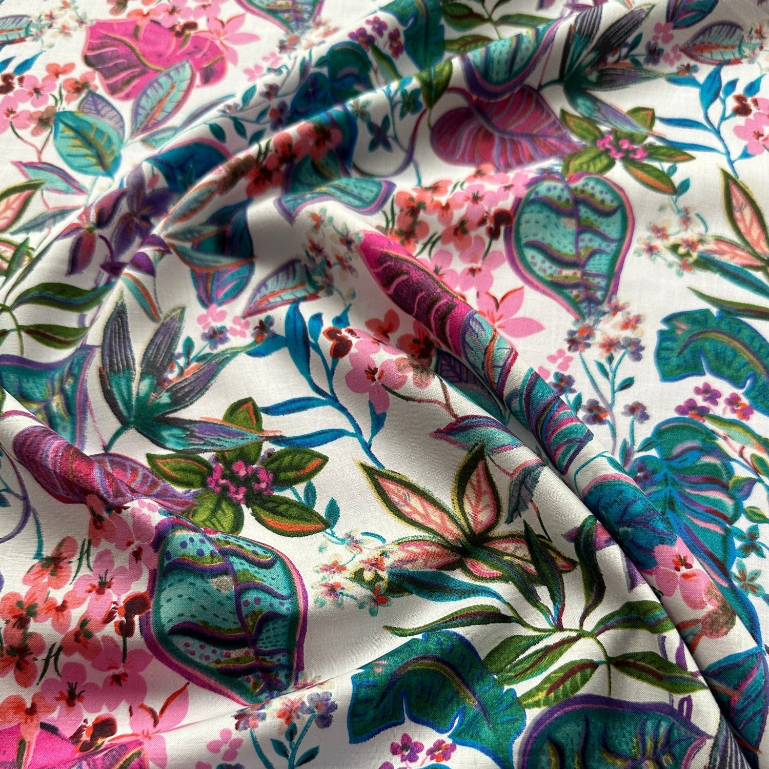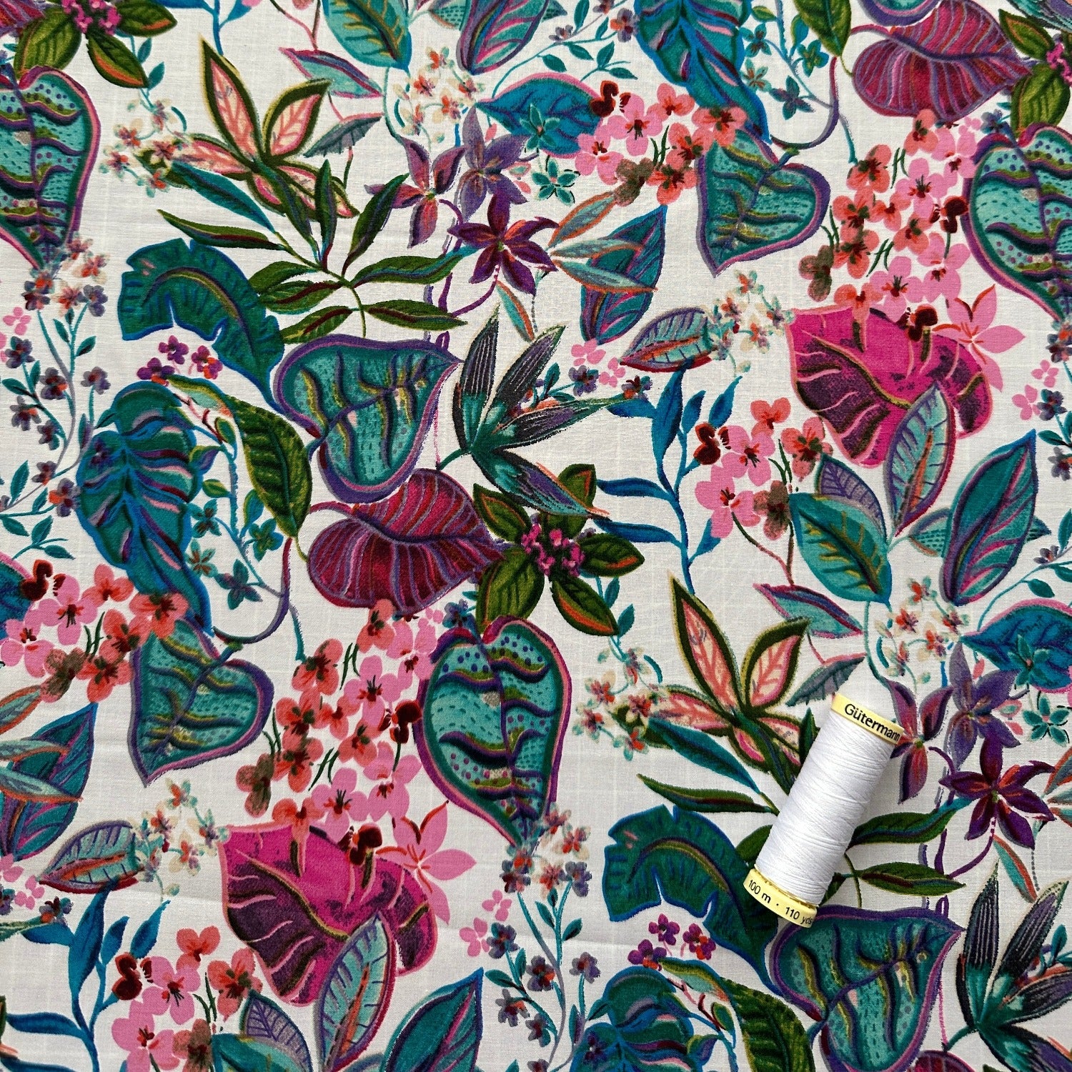 This gorgeous pima cotton lawn dressmaking fabric has an off white background with beautiful flowers and leaves across it in pinks, teals, greens, blues and purples. This fabric would be beautiful sewn up into a blouse, summery dress, skirt, blouse or pyjamas. Cotton lawn is lovely to sew with, and it is great if you are new to dressmaking because it doesn't move about too much when you are cutting out or sewing.
