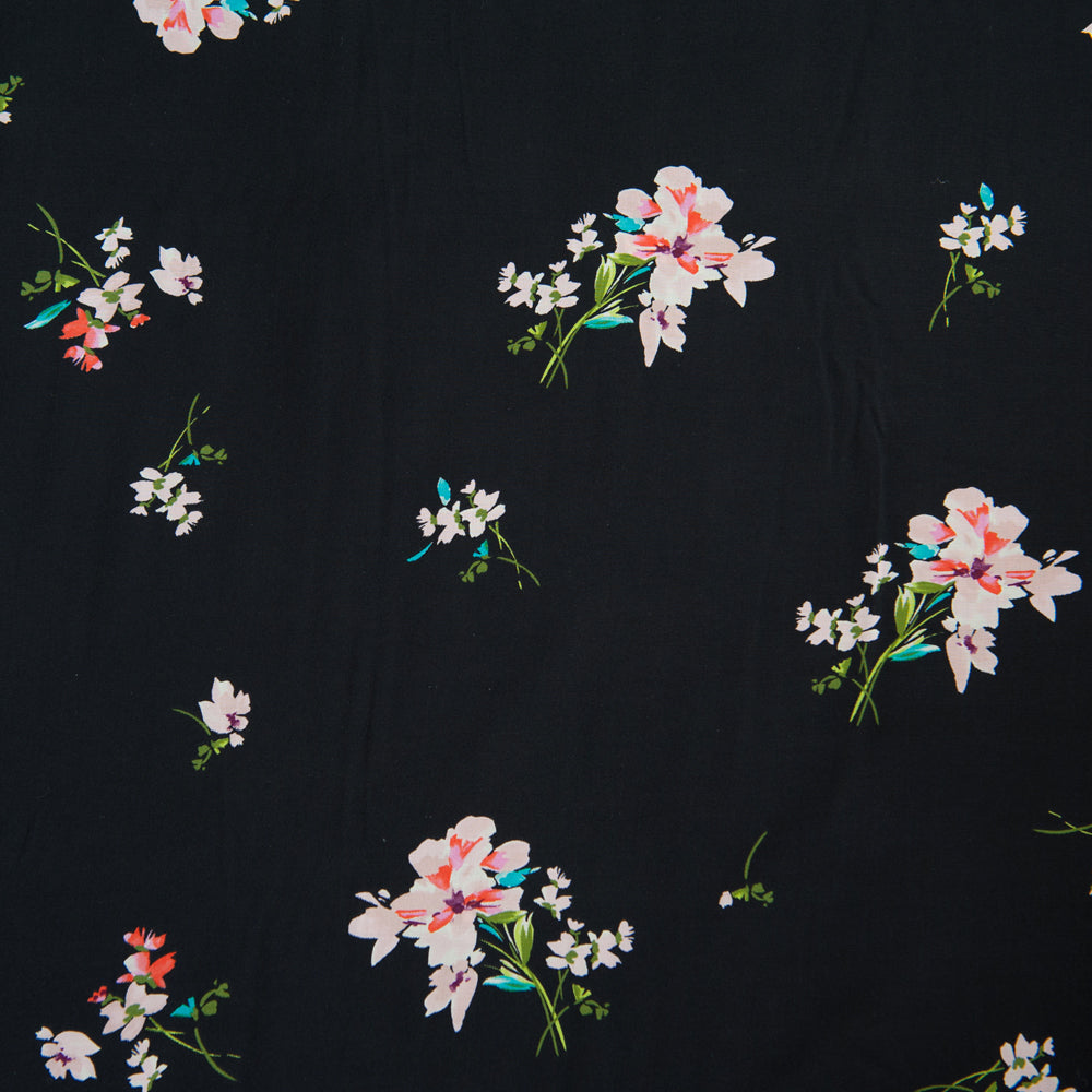 Black viscose with a beautiful floral pattern in pinks and greens. Soft, lightweight and drapey. Perfect for dresses, tops, kimonos and light weight trousers