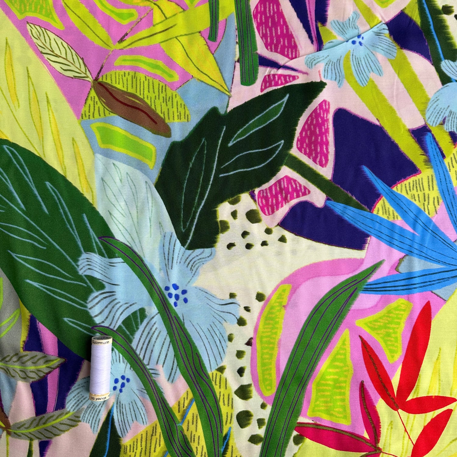 This eye catching viscose twill fabric has large scale leaves in bright colours across it. It feels lovely and soft, it has a slight sheen to it and an almost silky texture. It has a diagonal twill weave and drapes beautifully. You could use this fabric to sew yourself a blouse, top, dress, scarf or skirt. This print was designed by Marylène Madou.