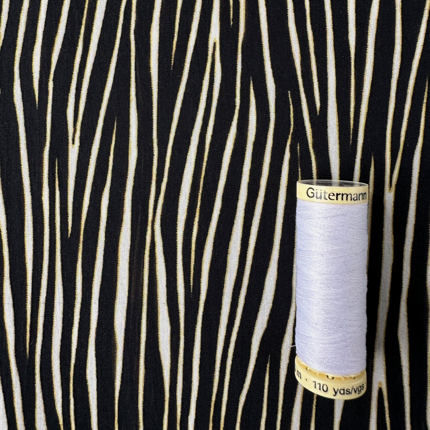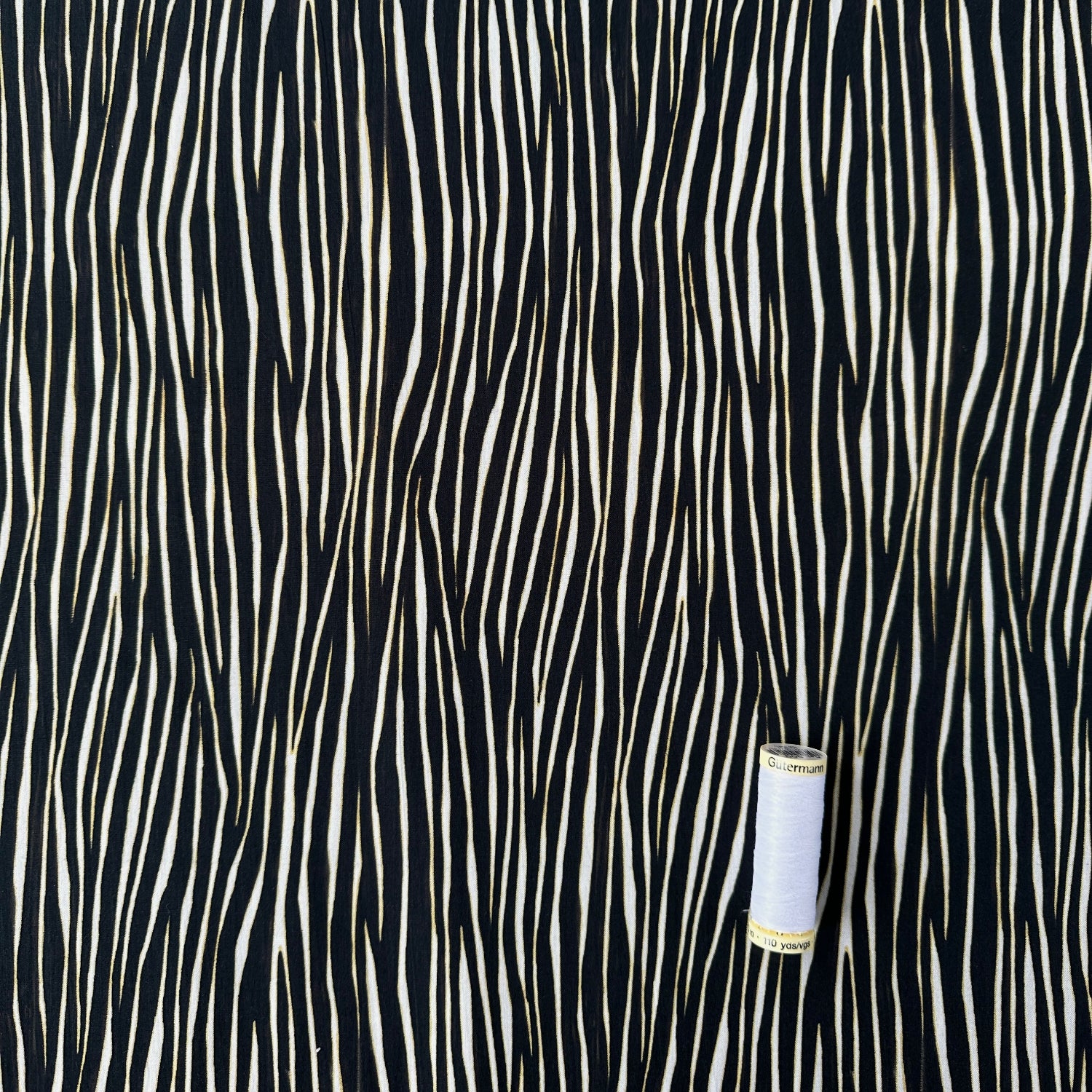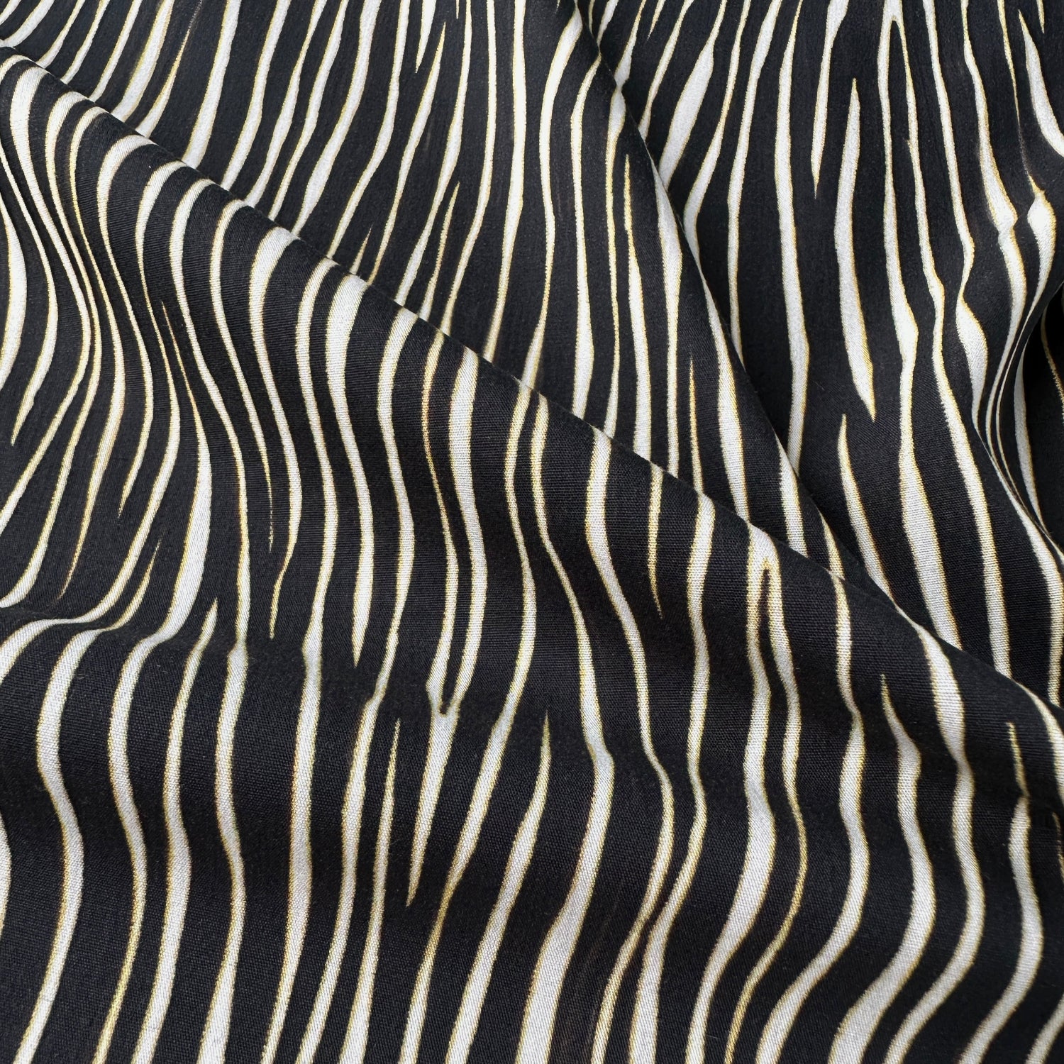 This gorgeous cotton poplin has a zebra animal print across it. It is black, off white and dark yellow This fabric would look amazing sewn up into a blouse, shirt dress, or top.